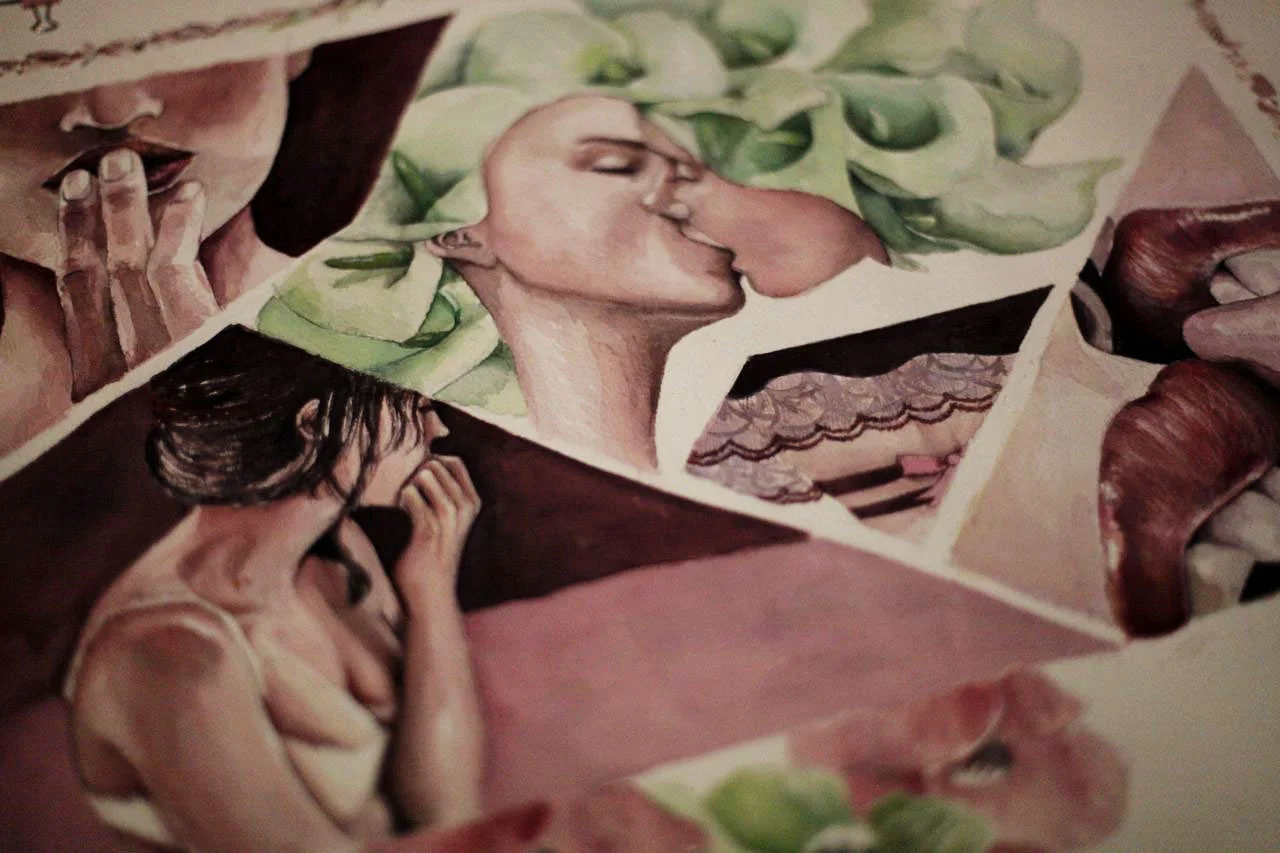 Vignettes of lust and desire. Anonymity. Uncertainty. Green with envy, she was jealous of the men. Awkwardness. A disarray of emotions (just as this description). And finally, deep shades of red for a darker passion, blossoming.