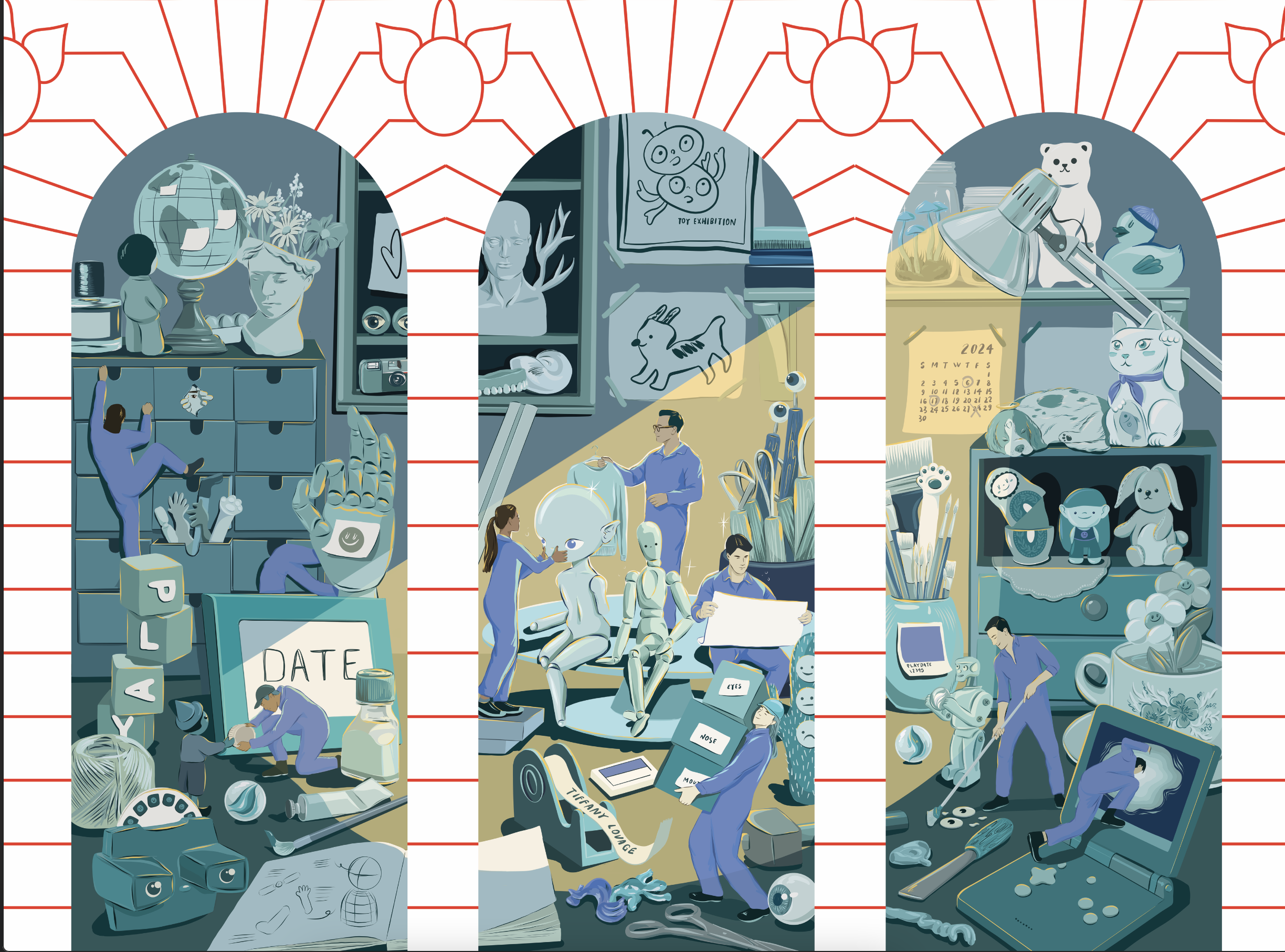 Artist at work! Details on a table are shown via toy parts, tools, tiny storage drawers and little helper “elves”, making up a toy sculptor’s workspace. The artwork plays with light and intricate details, mirroring the toy making process.